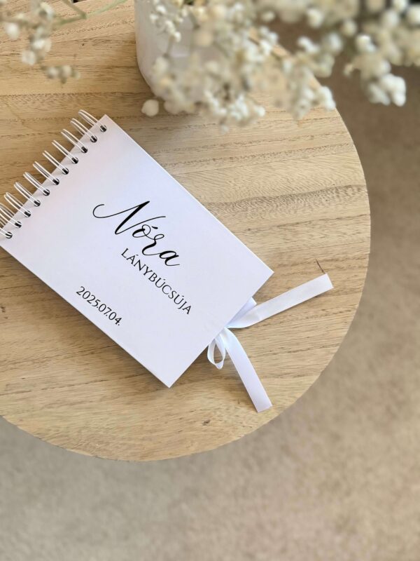 Keményfedeles spirálkötésű emlékkönyv, amely remek ajándék lehet egy lánybúcsún, akár előre képekkel és üzenetekkel feltöltve, vagy a lánybúcsú egyik programjaként közösen is készíthettek a menyasszony számára ajándékot.