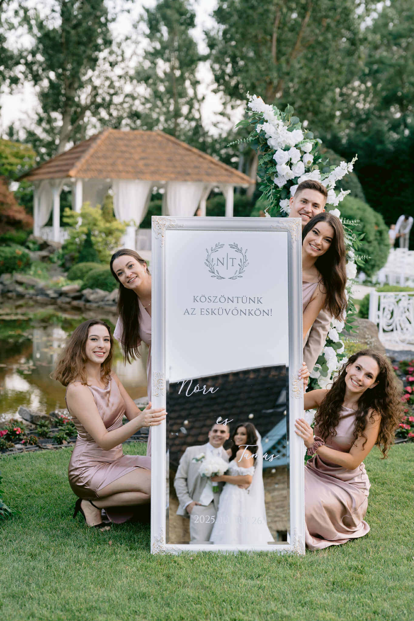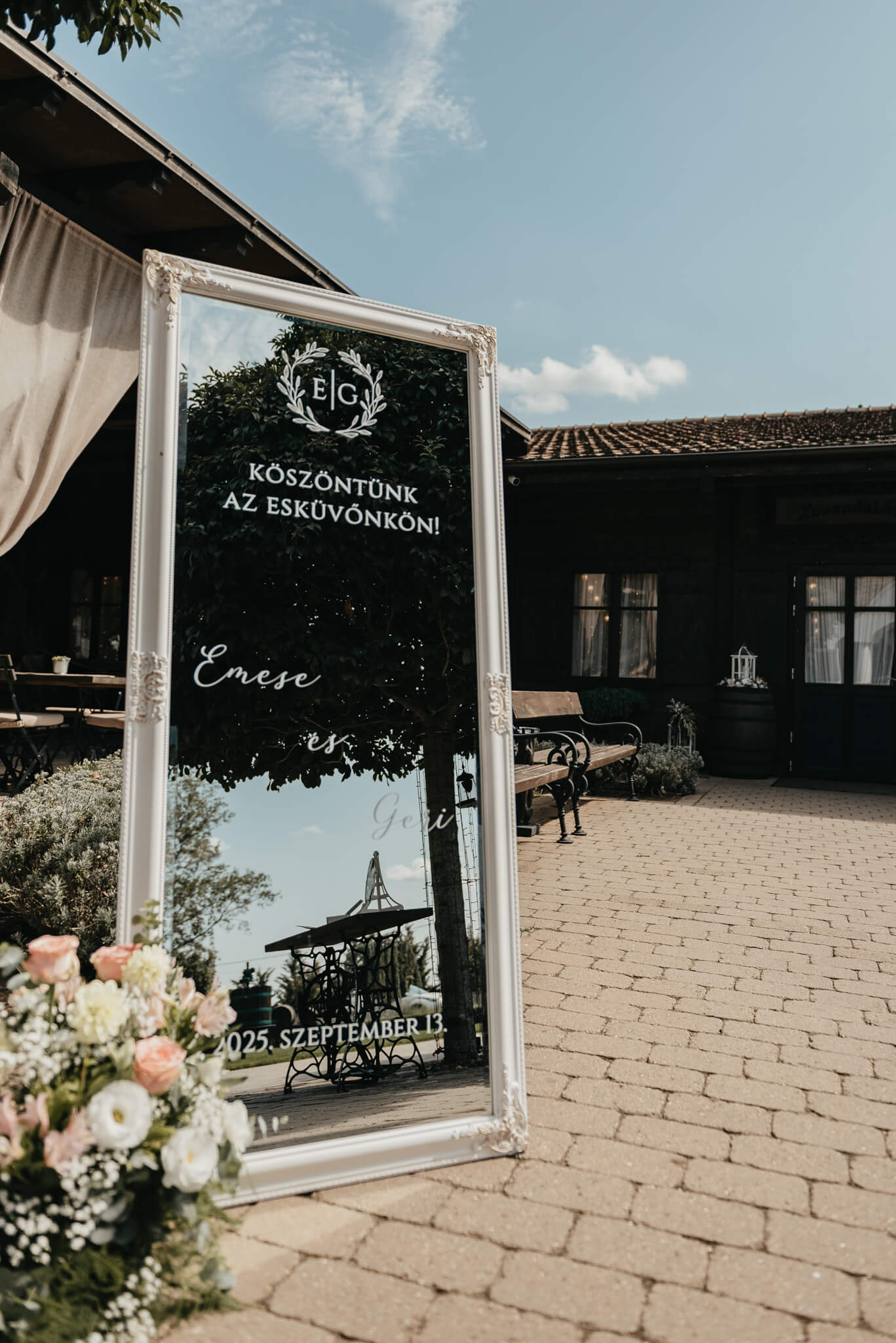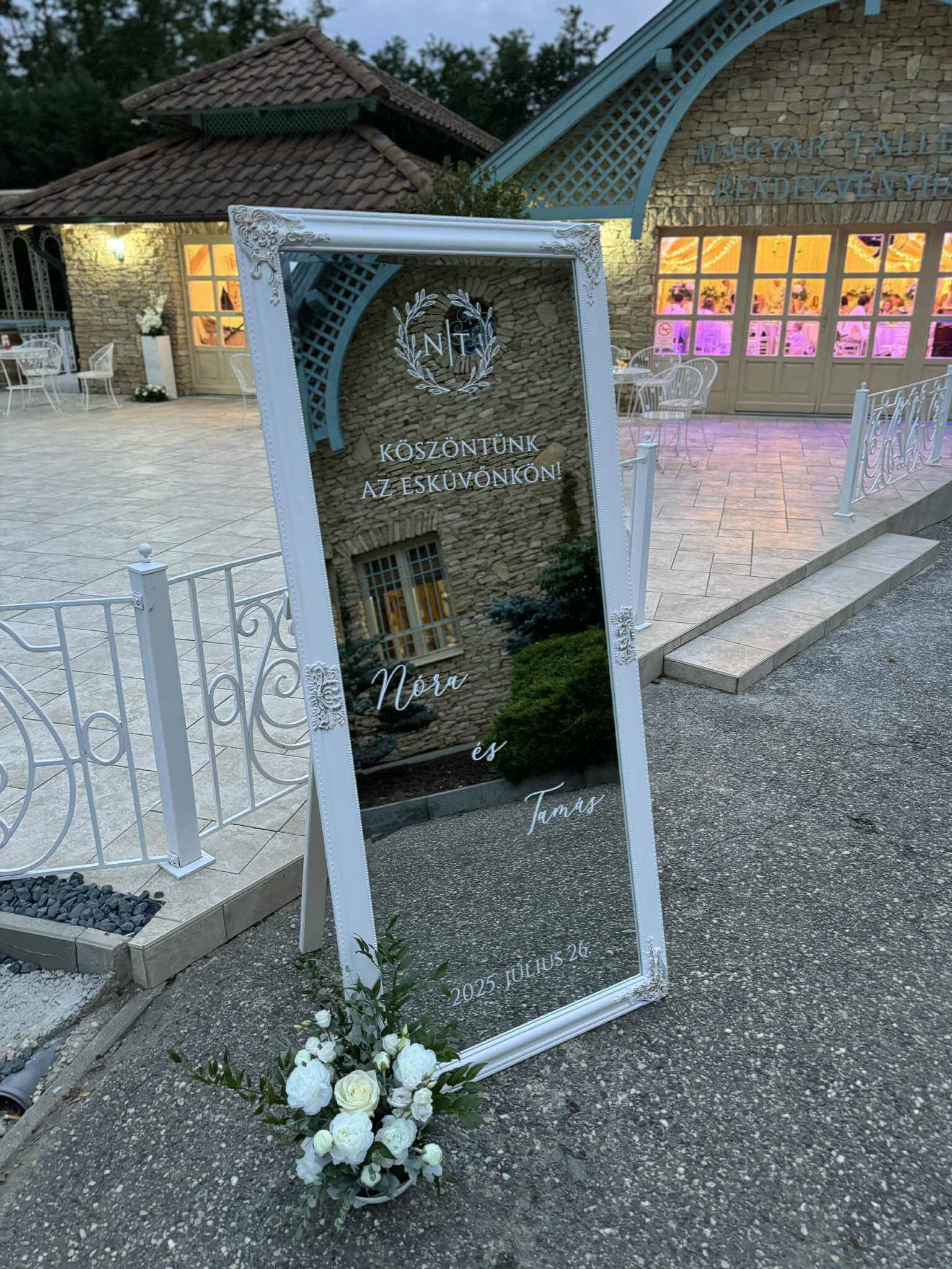 Dobd fel az esküvői dekorációt egy feliratozott tükörrel, ami szolgálhat köszöntőtáblaként, ültetőtáblaként, vagy tartalmazhat egy kedves üzenetet a vendégek számára.